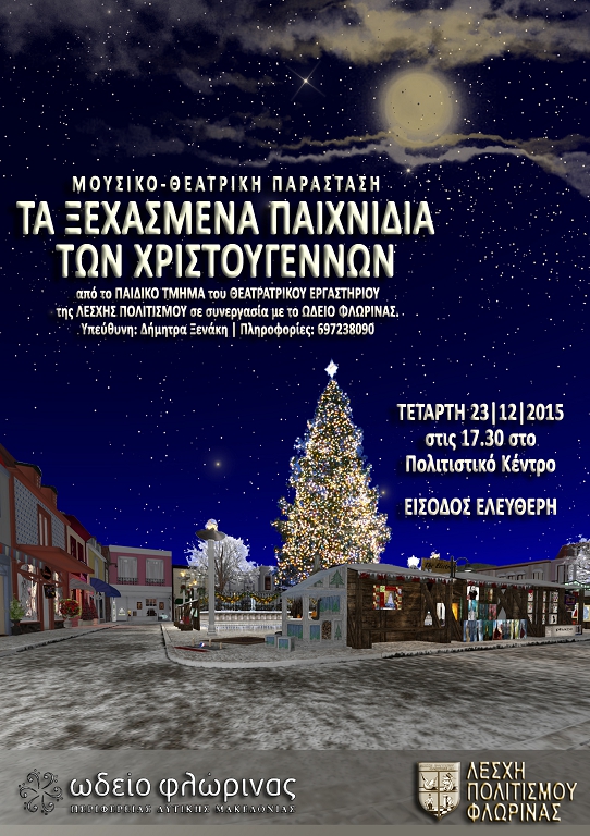 Σας προσκαλούμε στη Μουσικο – Θεατρική παράσταση “Τα ξεχασμένα παιχνίδια των Χριστουγέννων” που παρουσιάζει το παιδικό τμήμα του θεατρικού εργαστηρίου της Λέσχης Πολιτισμού Φλώρινας, την Τετάρτη 23 Δεκεμβρίου 2015, στις 17:30, στην θεατρική σκηνή του Πολιτιστικού Κέντρου (αίθουσα Θόδωρος Αγγελόπουλος).