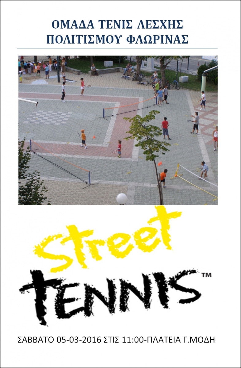 Με αφορμή τον φετινό εορτασμό της παγκόσμιας ημέρας tennis στις 8 Μαρτίου 2016 και ύστερα από απόφαση του ΔΣ της Ένωσης Σωματείων Αντισφαίρισης Κεντροδυτικής Μακεδονίας θα διοργανωθεί στην πόλη της Φλώρινας Steet Tennis από το τμήμα αντισφαίρισης της Λέσχης Πολιτισμού Φλώρινας .
