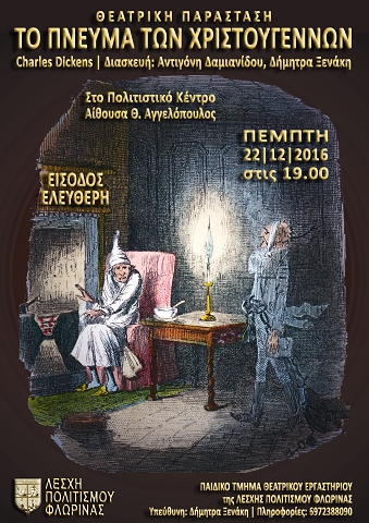 Σας προσκαλούμε στην παράσταση “Το Πνεύμα των Χριστουγέννων”, του Κάρολου Ντίκενς, που παρουσιάζει το παιδικό τμήμα του θεατρικού εργαστηρίου της Λέσχης Πολιτισμού Φλώρινας, την Πέμπτη 22 Δεκεμβρίου στις 19:00, στη θεατρική σκηνή του Πολιτιστικού Κέντρου (αίθουσα Θεόδωρος Αγγελόπουλος).