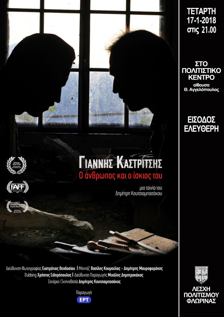 Η Λέσχη Πολιτισμού Φλώρινας σας προσκαλεί στην προβολή της ταινίας «Γιάννης Καστρίτσης ο άνθρωπος και ο ίσκιος του» που θα προβληθεί την Τετάρτη 17 Ιανουαρίου 2018 στις 21:00 στο Πολιτιστικό Κέντρο Φλώρινας (αίθουσα «Θόδωρος Αγγελόπουλος»). Η ταινία είναι παραγωγή της ΕΡΤ και προέρχεται από το αρχείο της ΕΡΤ Α.Ε.