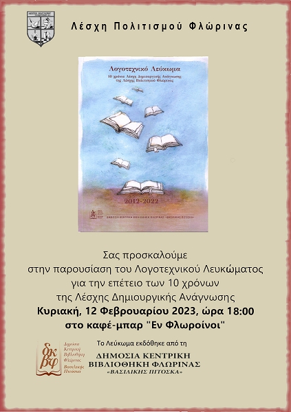 Σας προσκαλούμε στην παρουσίαση του Λογοτεχνικού Λευκώματος, για τα 10 χρόνια της Λέσχης Δημιουργικής Ανάγνωσης, της Λέσχης Πολιτισμού Φλώρινας, που θα γίνει την Κυριακή 12 Φεβρουαρίου 2023, στις 6μ.μ, στο καφέ μπαρ «Εν Φλωροίνοι».