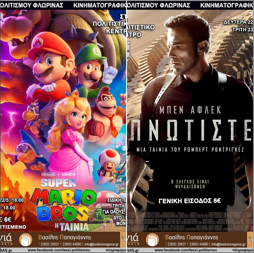 Αυτή την εβδομάδα, λόγω των βουλευτικών εκλογών δεν θα έχουμε προβολές την Κυριακή. Την Δευτέρα και την Τρίτη θα προβάλλουμε και πάλι, για όσους δεν πρόλαβαν να την δουν, την καταπληκτική ταινία κινουμένων σχεδίων “SUPER MARIO BROS. Η ΤΑΙΝΙΑ” καθώς και την περιπέτεια μυστηρίου με τον Μπεν Άφλεκ “ΥΠΝΩΤΙΣΤΕΣ”!