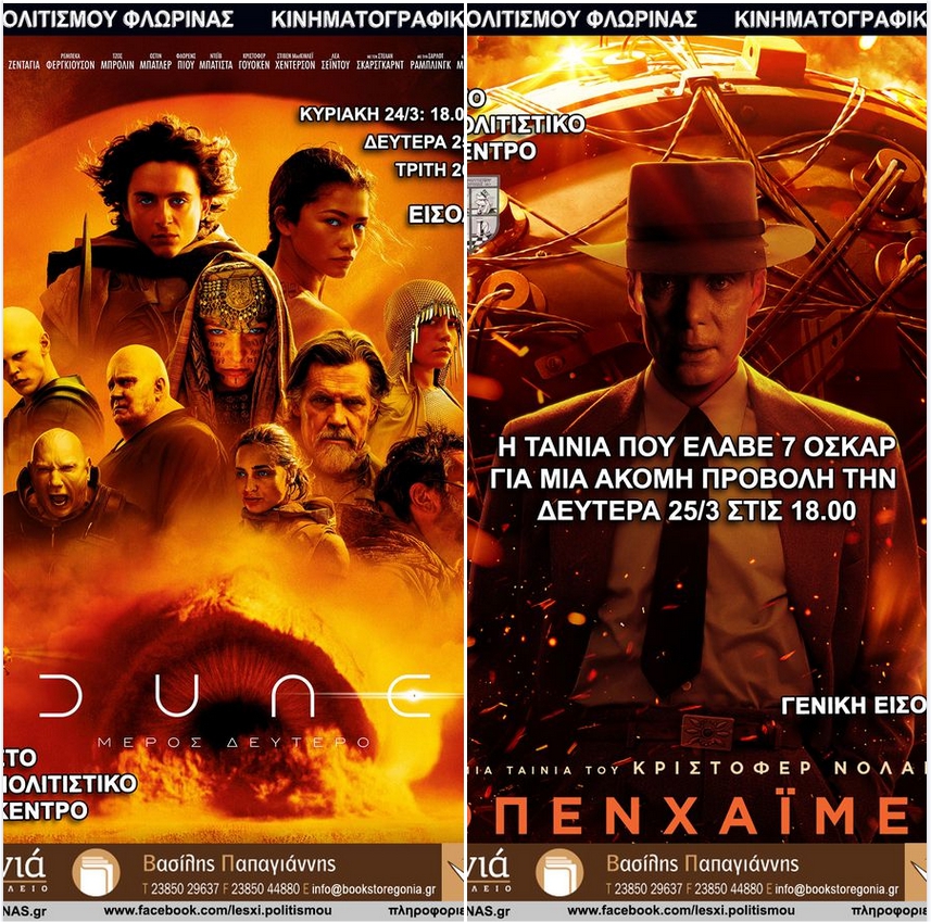 Την επόμενη εβδομάδα θα προβάλλουμε την περιπέτεια δράσης “DUNE: ΜΕΡΟΣ ΔΕΥΤΕΡΟ”, ενώ εξασφαλίσαμε μια ακόμη προβολή ταινίας “ΟΠΕΝΧΑΪΜΕΡ” που έλαβε 9 όσκαρ!