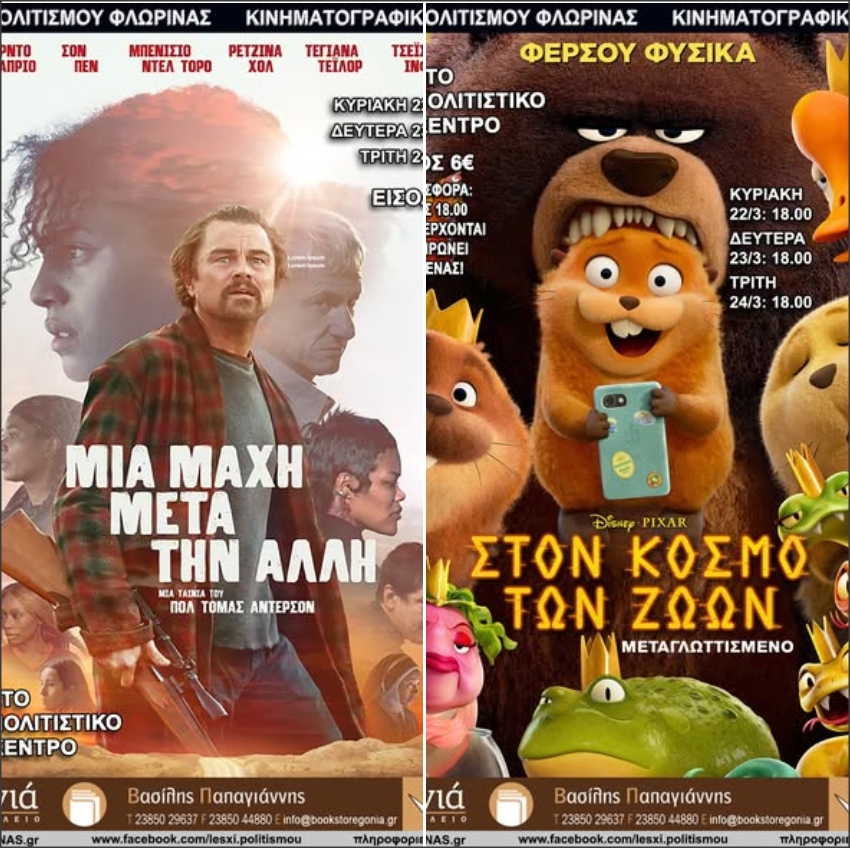 Η προβολή της ταινίας “ΣΤΟΝ ΚΟΣΜΟ ΤΩΝ ΖΩΩΝ” της Τρίτης 24/3 στις 18.00 ΔΕΝ θα πραγαματοποιηθεί λόγω μη διαθεσημότητας της αίθουσας. Έτσι η ειδική προσφορά “ΕΡΧΟΝΤΑΙ ΔΥΟ – ΠΛΗΡΩΝΕΙ ΜΟΝΟ Ο ΕΝΑΣ” μεταφέρεται τη Δευτέρα 23/3 στις 18.00. Επίσης με την ίδια ειδική προσφορά θα πραγματοποιηθεί η προβολή της Τρίτης 24/3 στις 21.00 της ταινίας “ΜΙΑ ΜΑΧΗ ΜΕΤΑ ΤΗΝ ΑΛΛΗ”. Έτσι το πρόγραμμα αναμορφώνεται συνολικά ως εξής:
